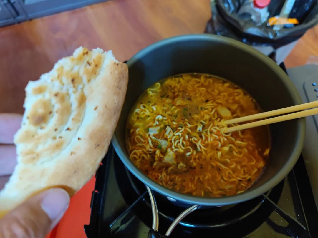 兄弟高反没有胃口,我就给自己煮了包面,配上馕。