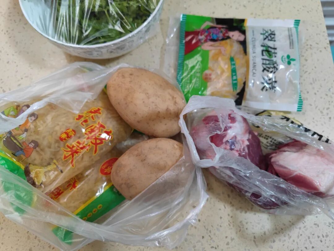下楼去买了一根肉骨头,三袋酸菜,两个土豆。