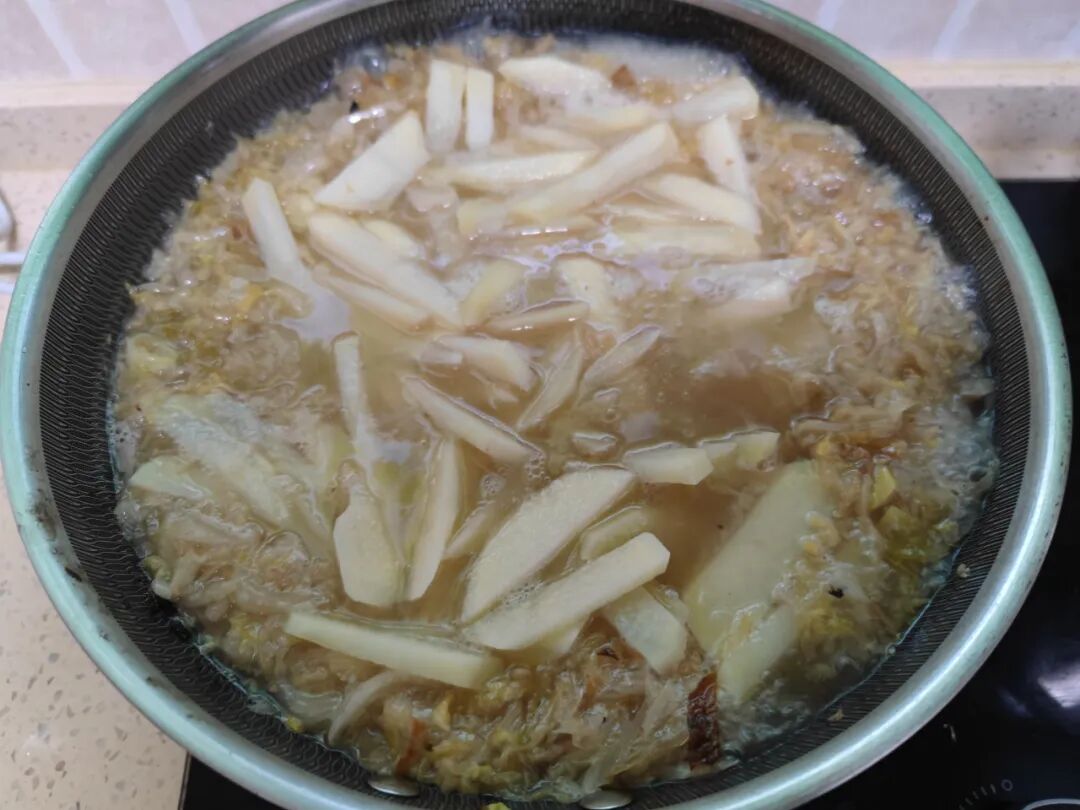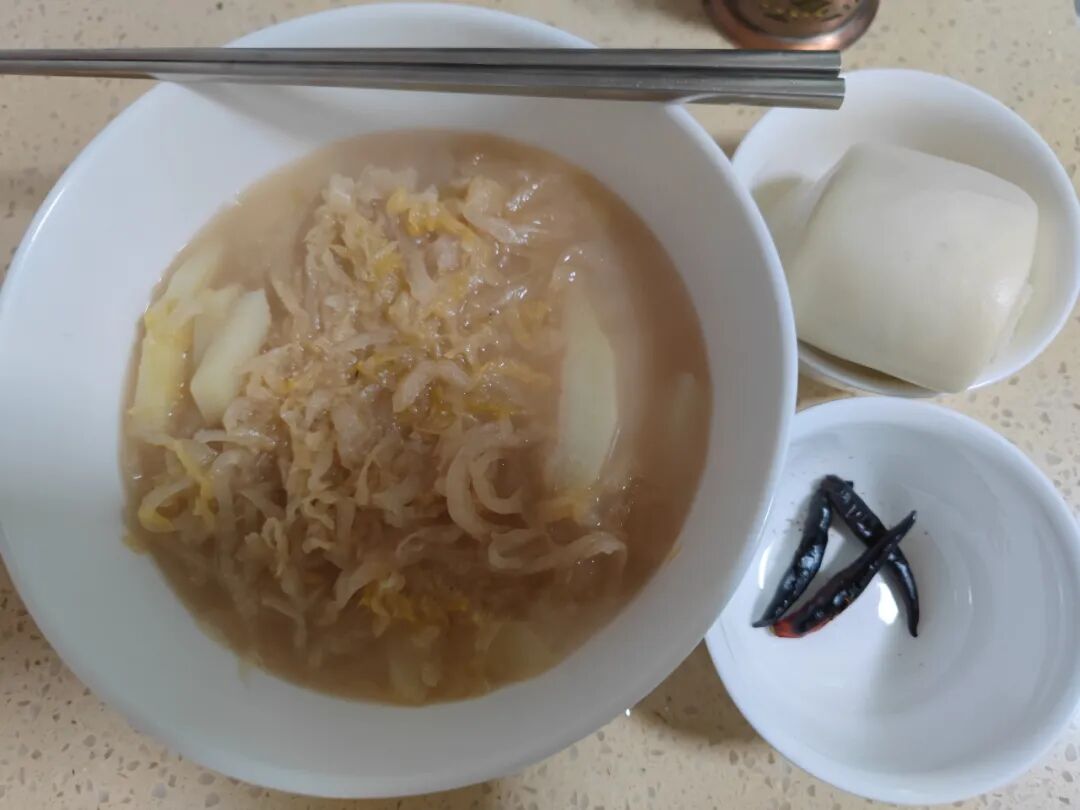 我尝了一口,嗯,酸酸的汤又香又开胃,喝到肚子里很舒服,土豆条绵软细腻,吸收了酸菜的味道后很好吃。