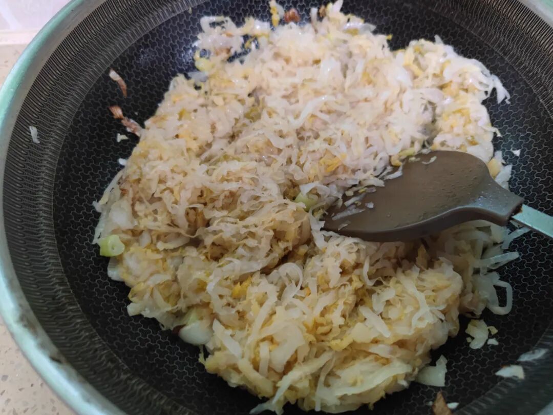 底油锅下葱花,炒香后下酸菜,加生抽和十三香翻炒。