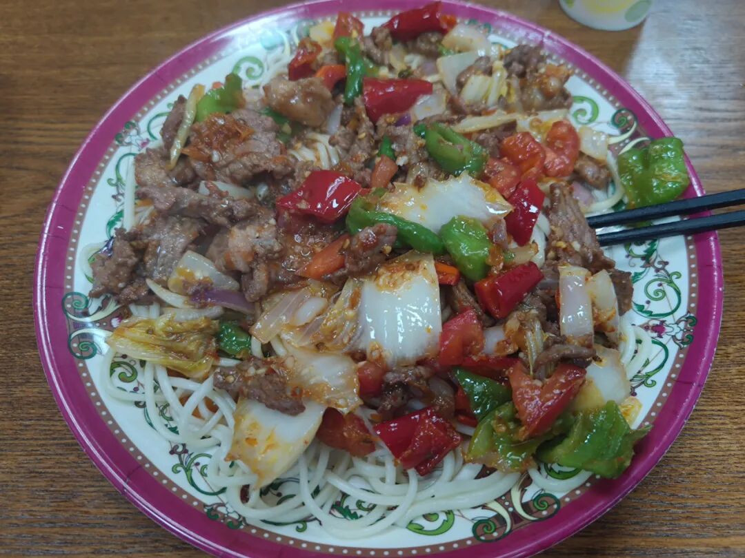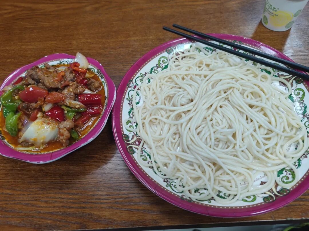 看完壮观的油田,我开到了白碱滩区,已经两天没吃正经饭、上一顿还是椒麻鸡拌面的我终于找到一家还开着的饭店,要了一份过油肉拌面。