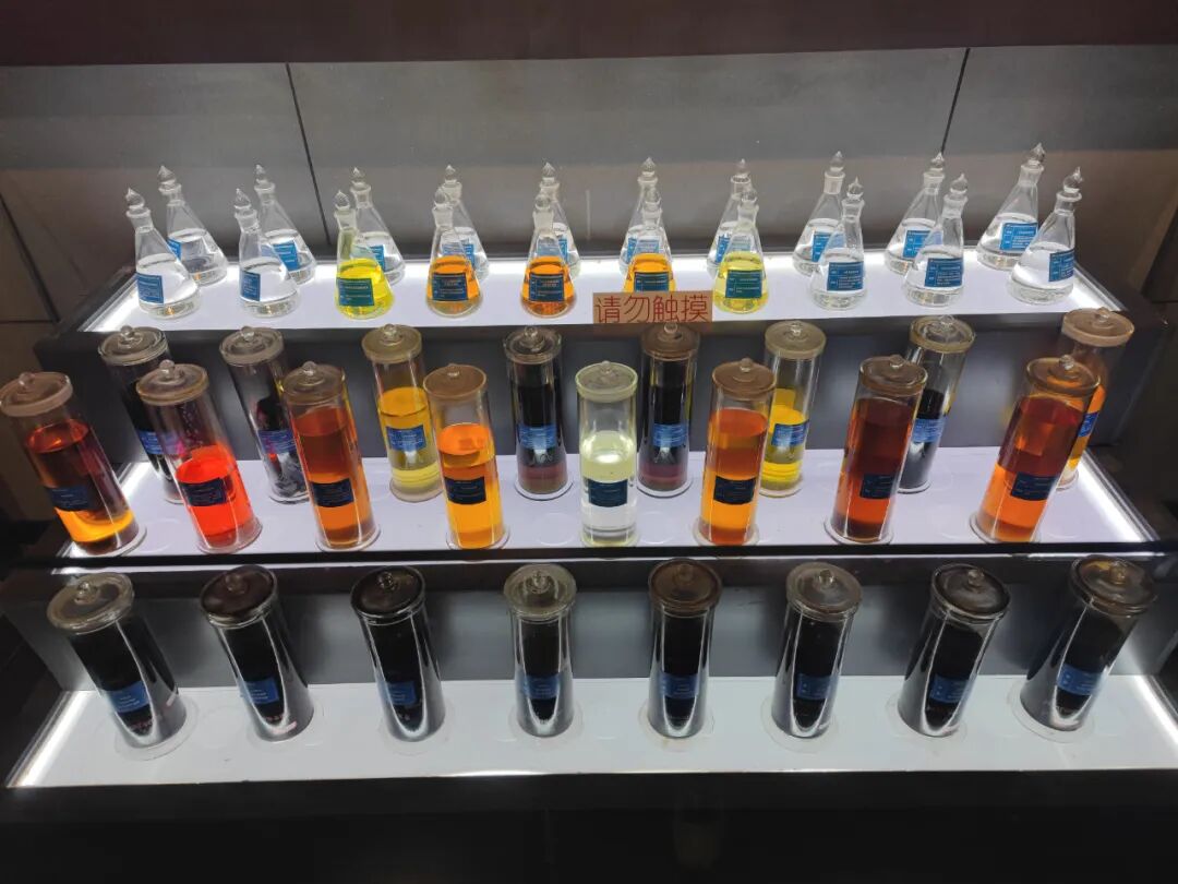 石油的逐步加工,最下面黑色的是原油,往上一层是炼制、分离、加工的汽油等,再往上是食品级的透明润滑油。