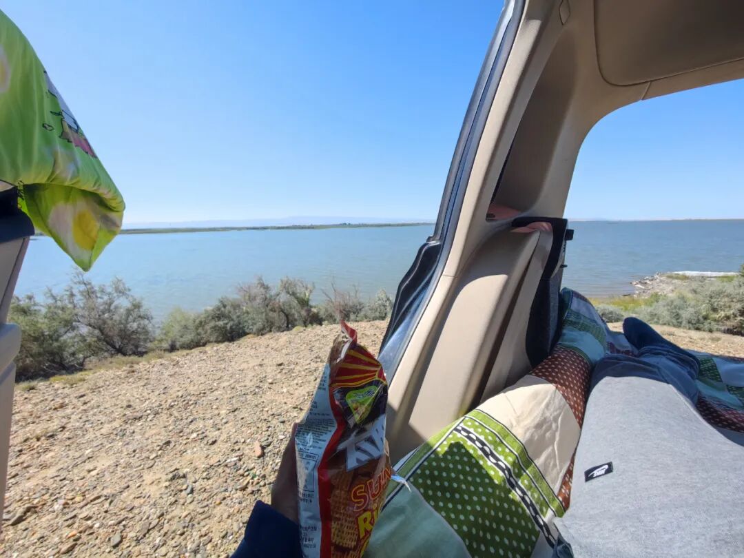 躺在车里,看着湖面吃锅巴。我就喜欢这种地方,不花钱还没人管。