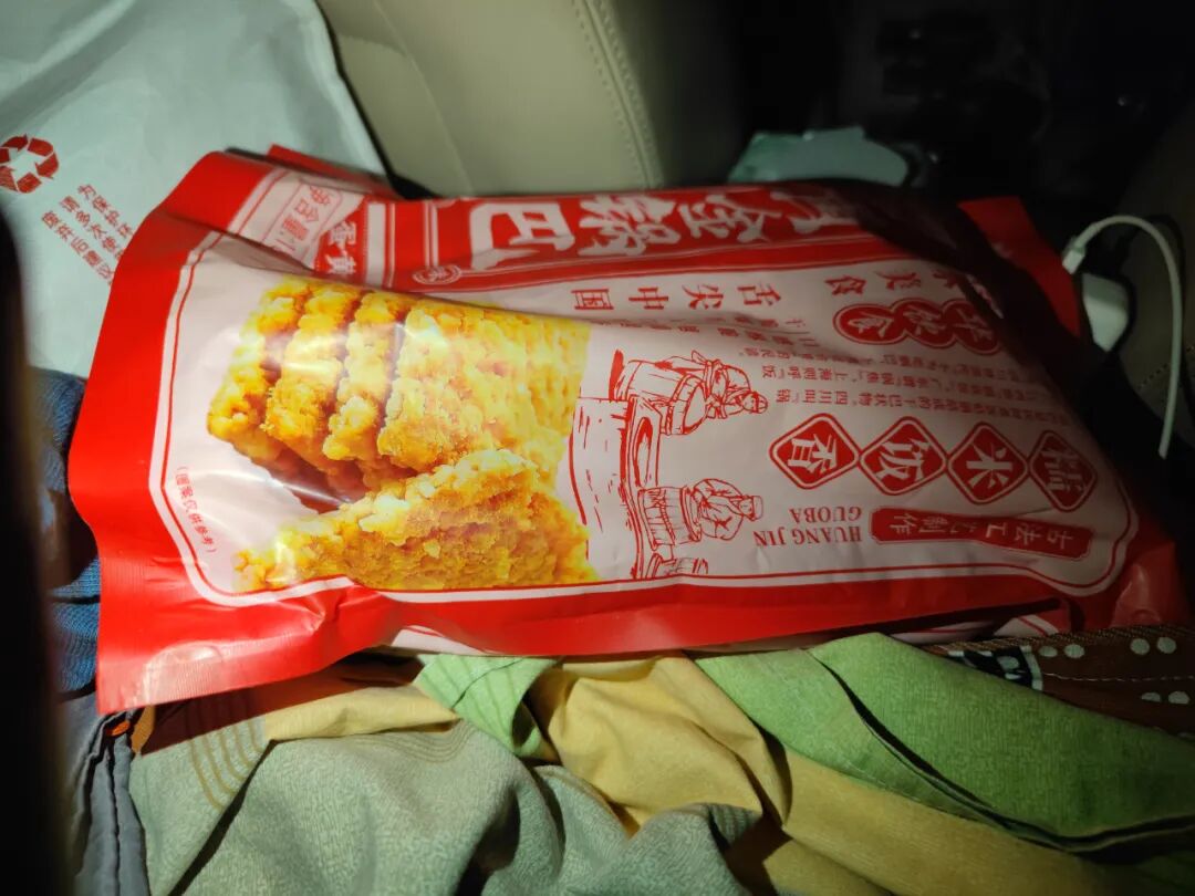 吃的都放在车座下的最里面,翻半天,翻出一袋锅巴。