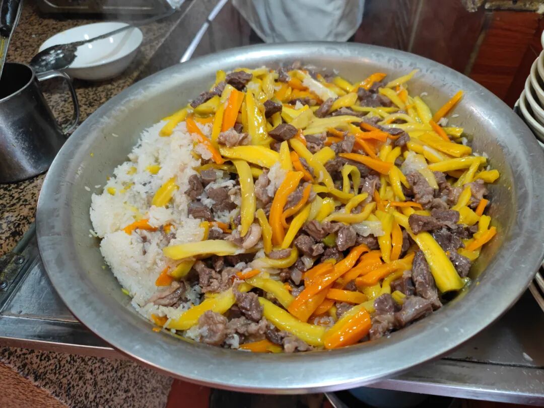 刚出锅的抓饭,这家的拌面和抓饭卖疯了,全是人,就这一盆抓饭,一会儿就没,后面灶台上有四五个蒸锅,轮着来。