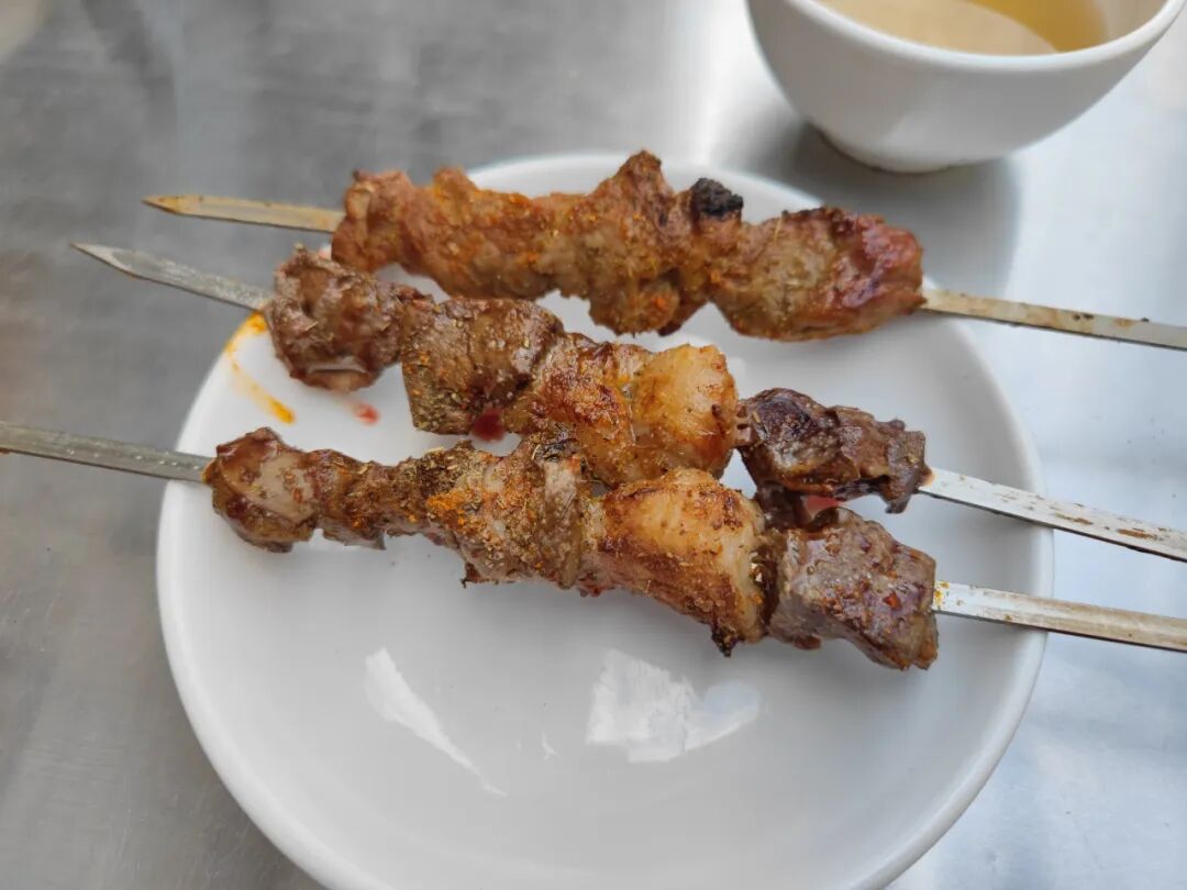 抓饭和拌面我都吃不下了,我最后的肚子,留给两串羊肝一串羊肉。