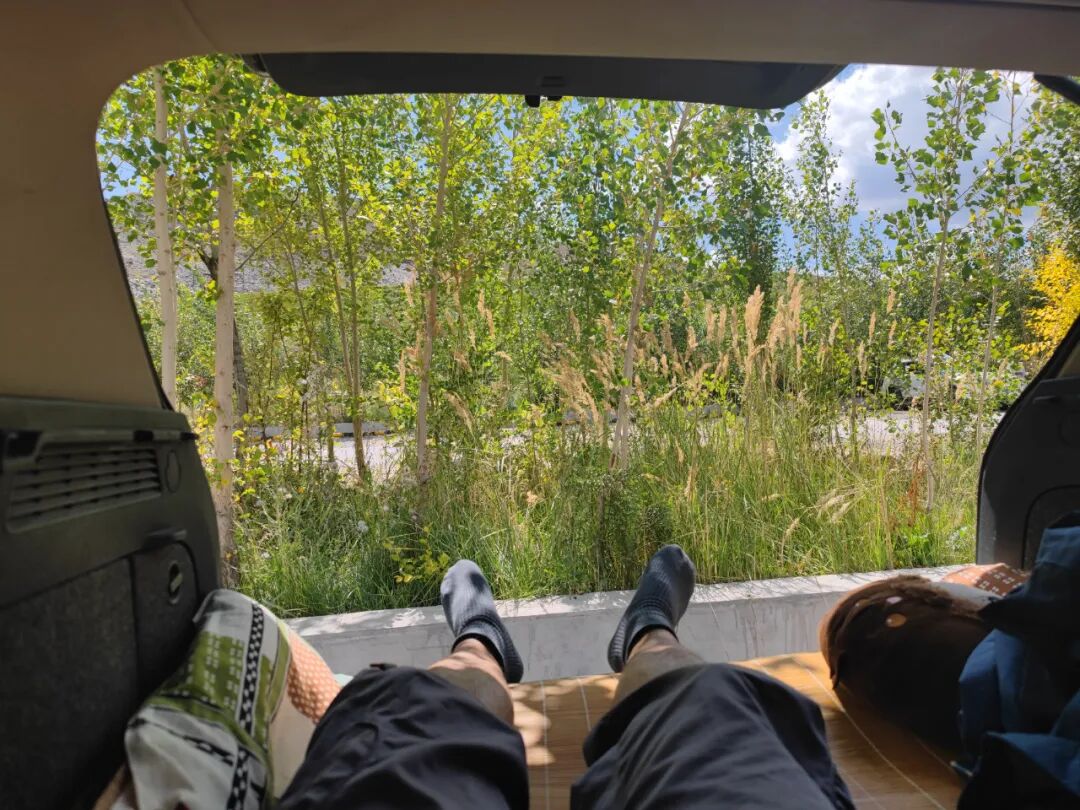 北面的温度不高,虽然太阳很晒,但车里很凉快。