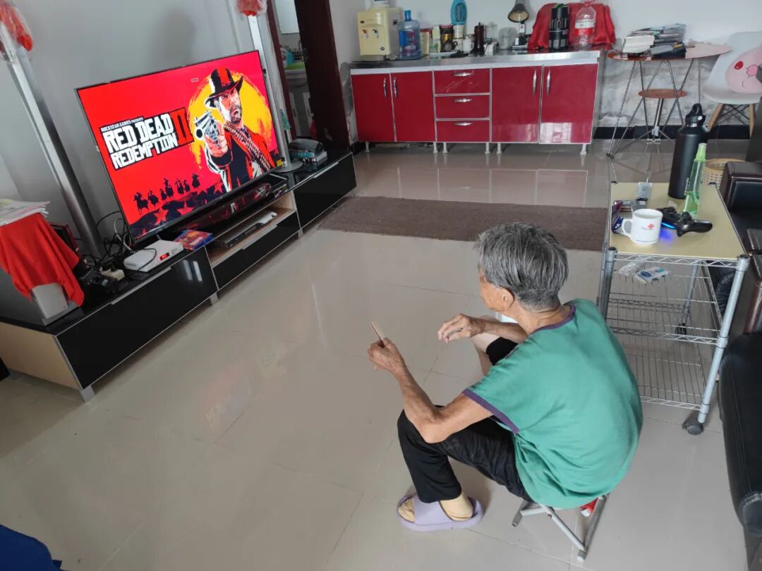 奶奶边吃威化巧克力边看我打游戏,她吃完一块我就再递给她一块,她说不要了留给我吃,我说我有的是你快吃吧!我让她坐在后面的沙发上,她不干自己搬个马扎坐下,我像在带一个好孩子。