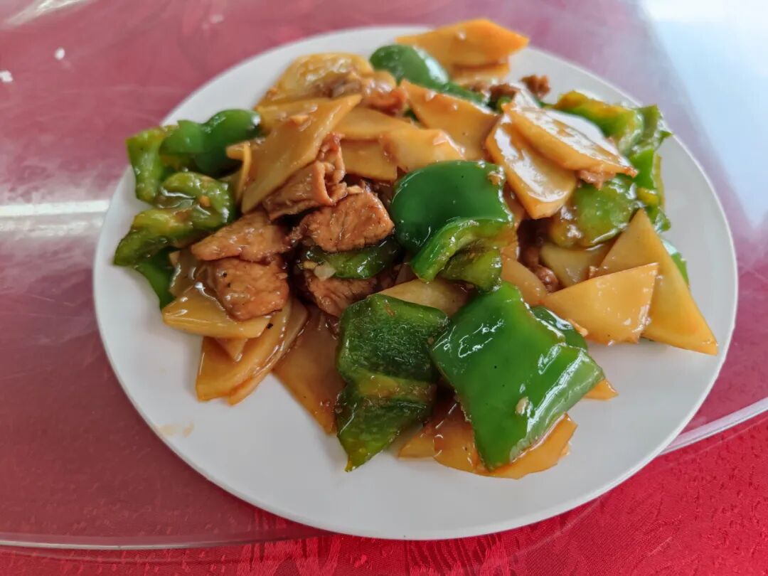 晚上又让厨子给我炒了个土豆青椒,我要求加点肉片,价钱跟中午一样就行。