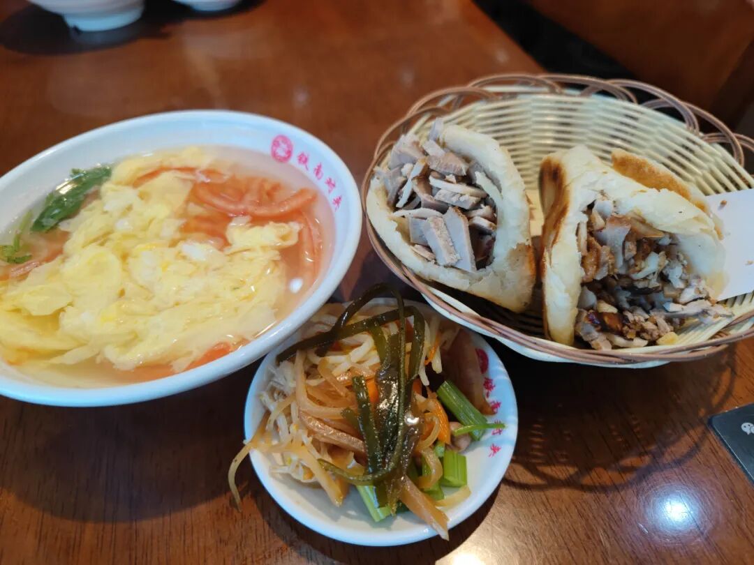 火烧外皮酥脆,里面夹着熏肉,五花肉更香一些。凡是烧饼夹的东西都好吃,从煎蛋到香肠,夹肉就更香了。西红柿鸡蛋汤是我最喜欢的,3元一大碗。这样的一餐早饭,带来一天的活力满满。