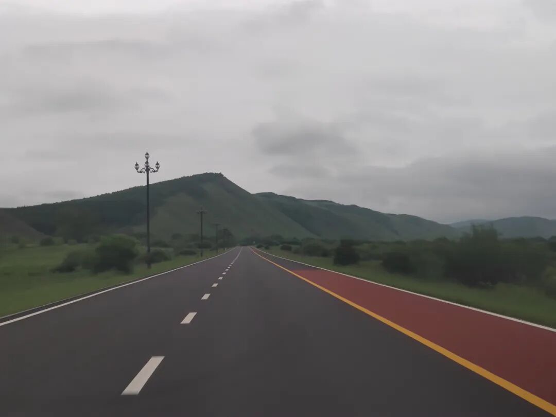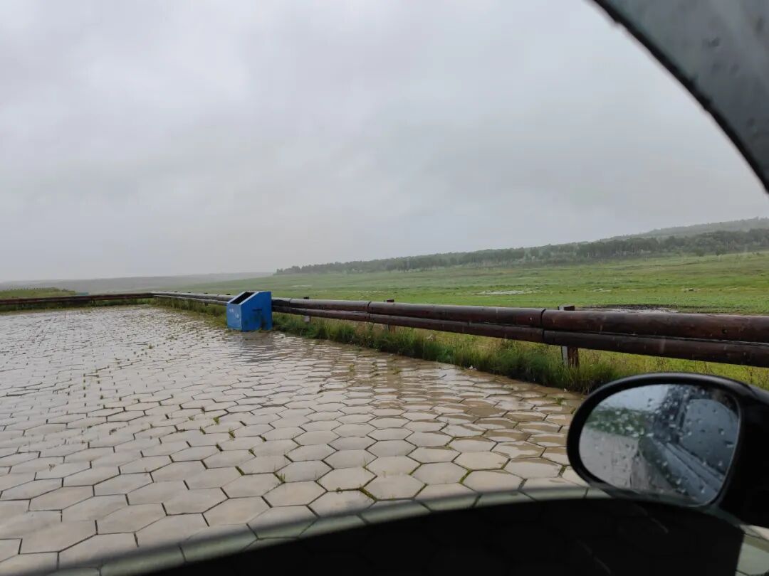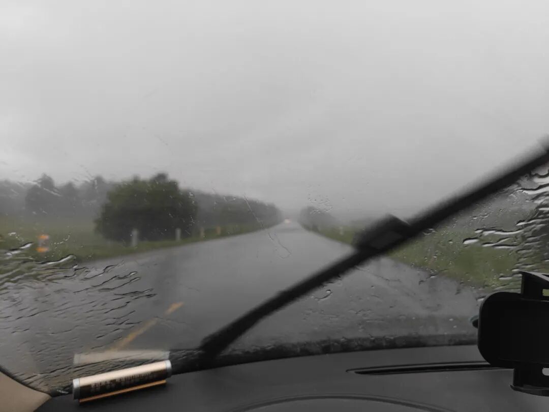 中间还经过暴雨路段,视线模糊,我打开车灯和双闪,降低车速,缓慢行进在雨中。