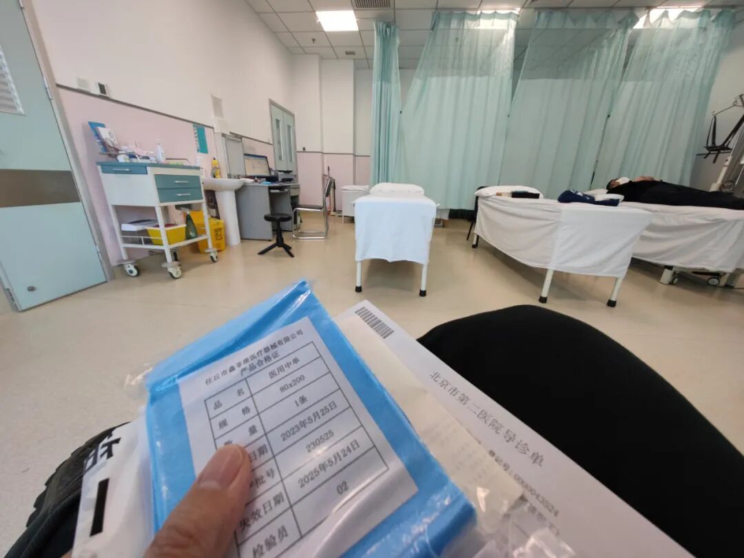 先是针灸。四根针扎进脖子,这个不太疼,就是有根针扎完后我的右胳膊整个麻了;三根针扎耳朵,这个扎的那一下还挺疼的。然后通上电,后脖子的两根筋就开始跳啊跳。