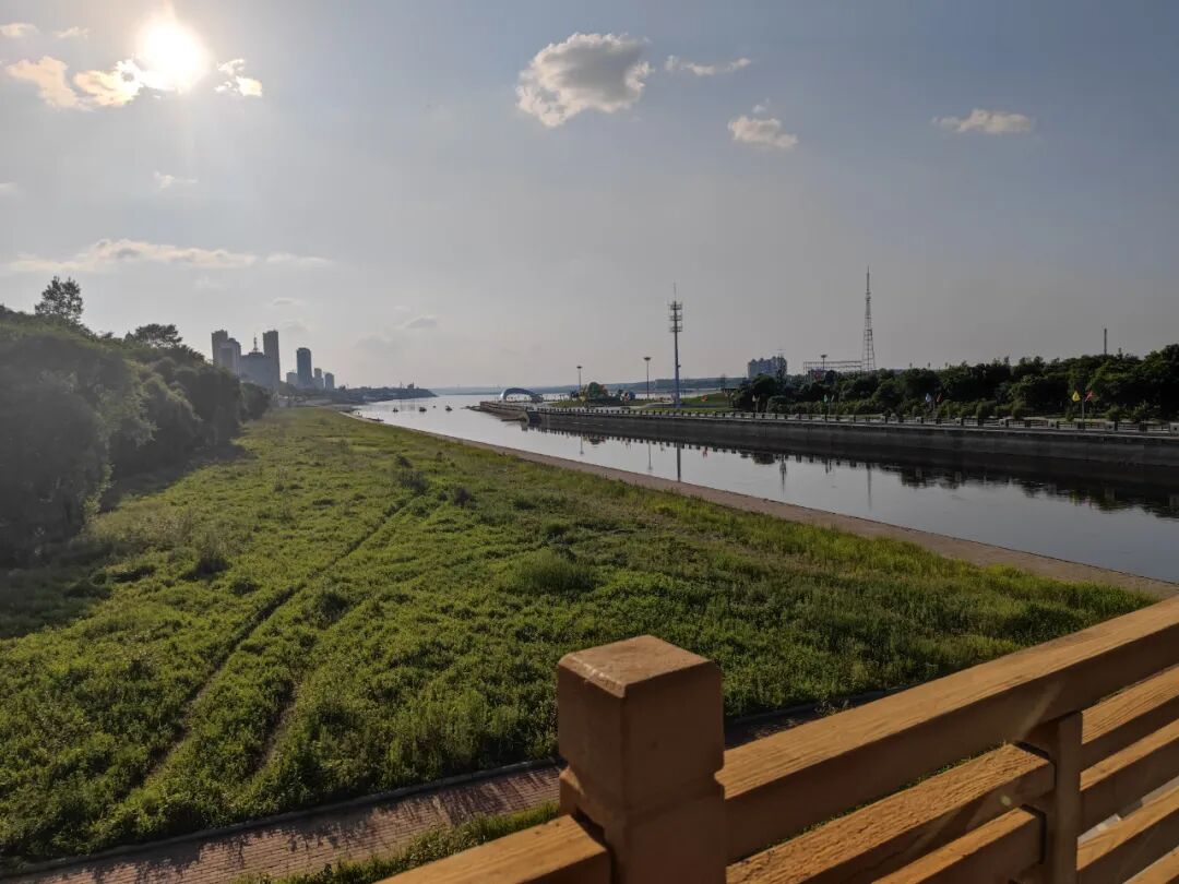 对面就是俄罗斯布拉格维申斯克市,对面河堤的街上有很多人在走动,那些都是俄罗斯人,这种感觉很有趣,我在这边喊一嗓子,那边也不知道是不是能听到,估计听到也听不懂。