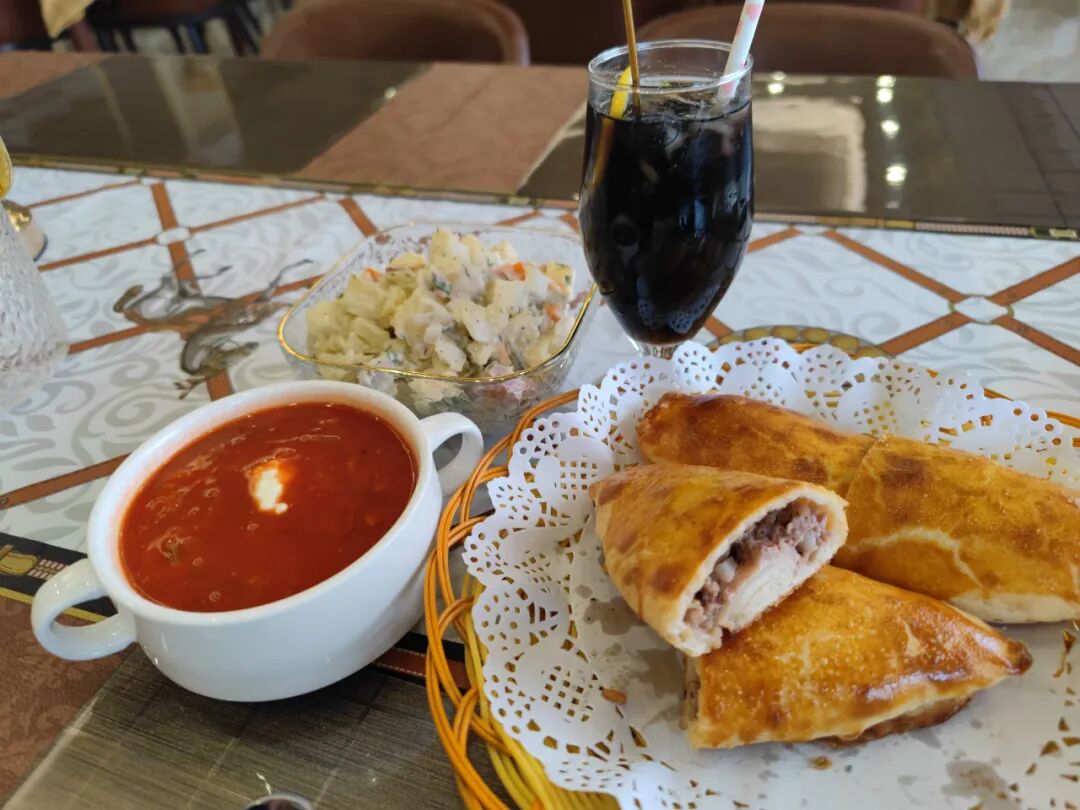 红菜汤是用西红柿一点点熬的,里面还有好多牛肉粒;沙拉的土豆和火腿特别好吃,我基本是拿勺风卷残云;牛肉馅饼里面馅挺多,份量很大,我这个饭量一份吃得饱饱的;冻柠檬茶也很惊艳,不是调料包冲出来的,是真的自制的,一点也不齁。