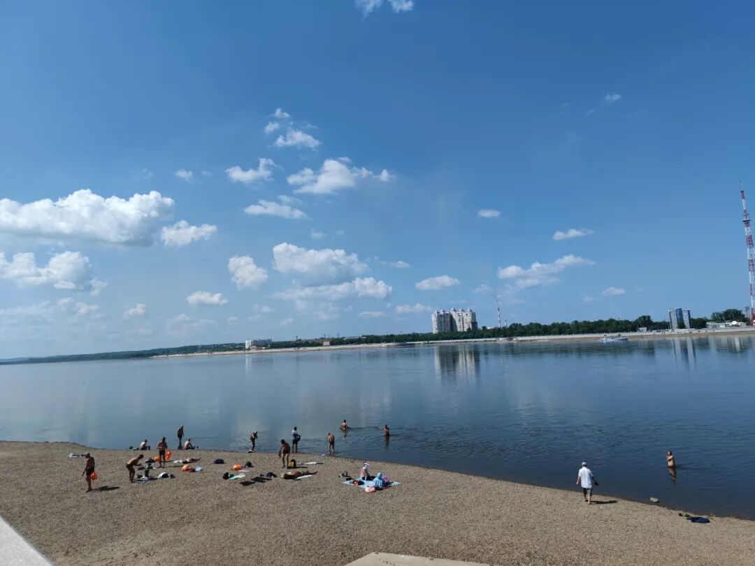 江里好多人在游泳啊,我这次往北走就没想到能游泳,也没带泳裤。