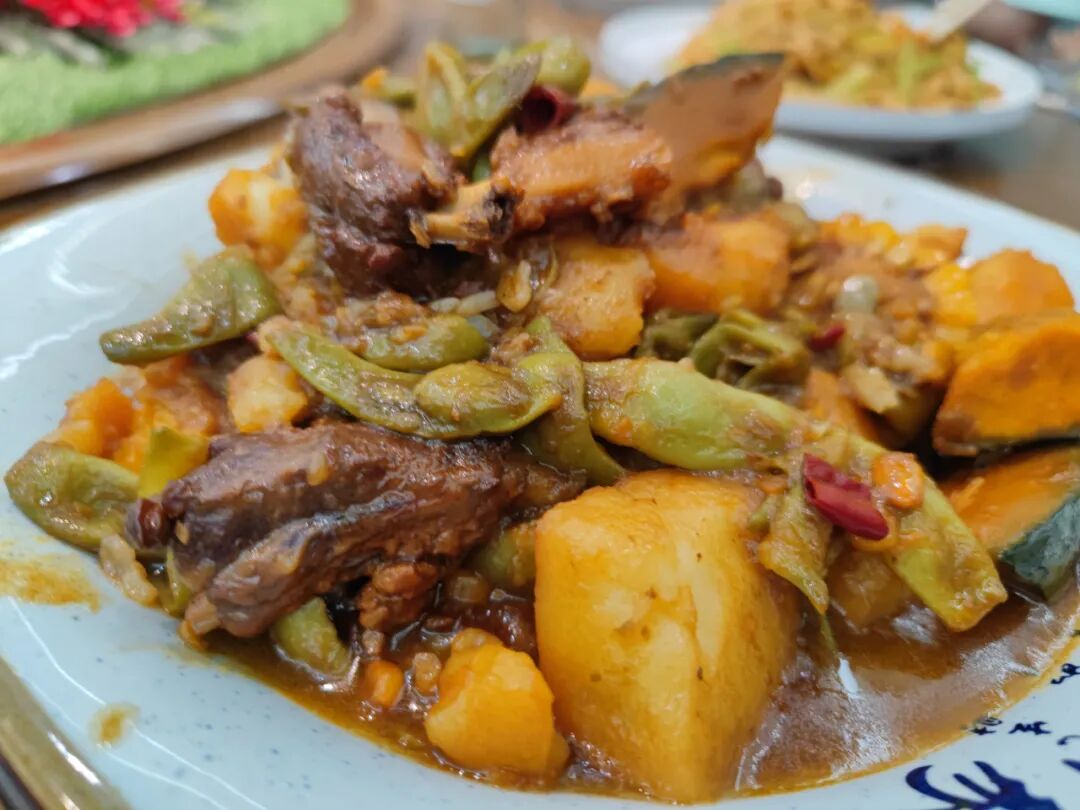 小鸡炖蘑菇的榛蘑,蘸酱菜里水灵灵的小葱生菜和灵魂蘸酱、可以炒尖椒也可以卷菜的干豆腐,铁锅炖里的大鹅、花卷和干豆角。