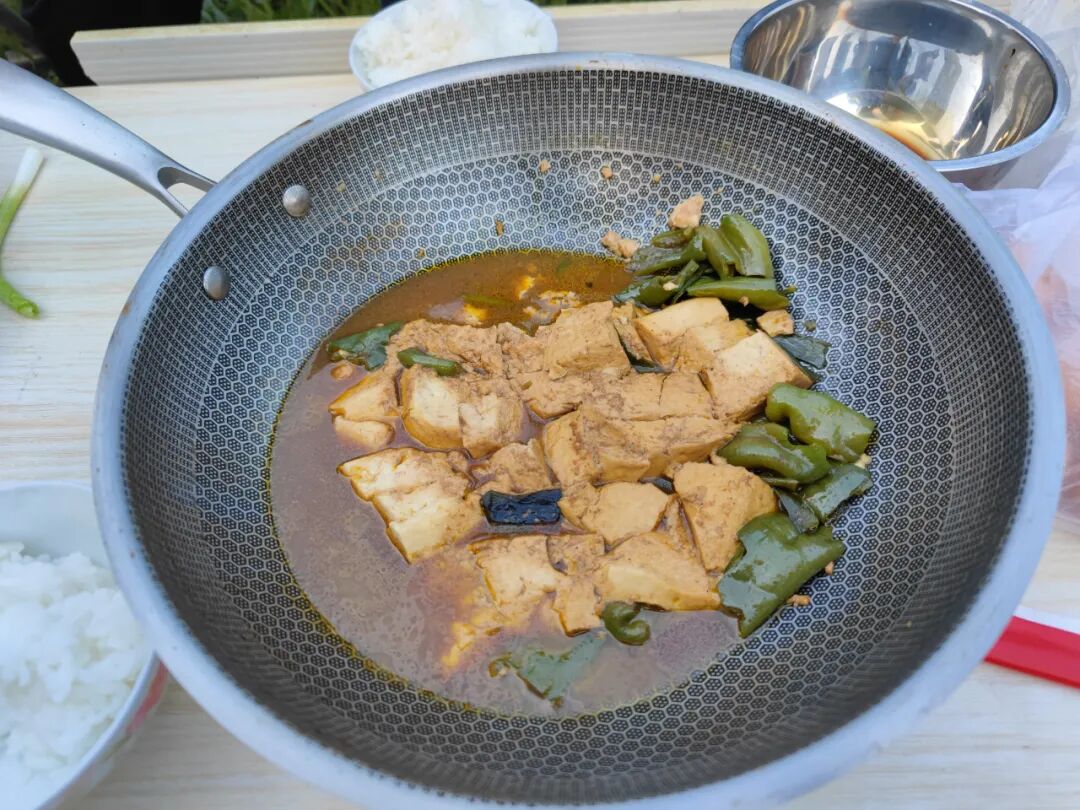 大婶非要我跟他们一起吃饭,他们用电饭锅蒸了米饭,煮了鸡蛋,烧了菜。