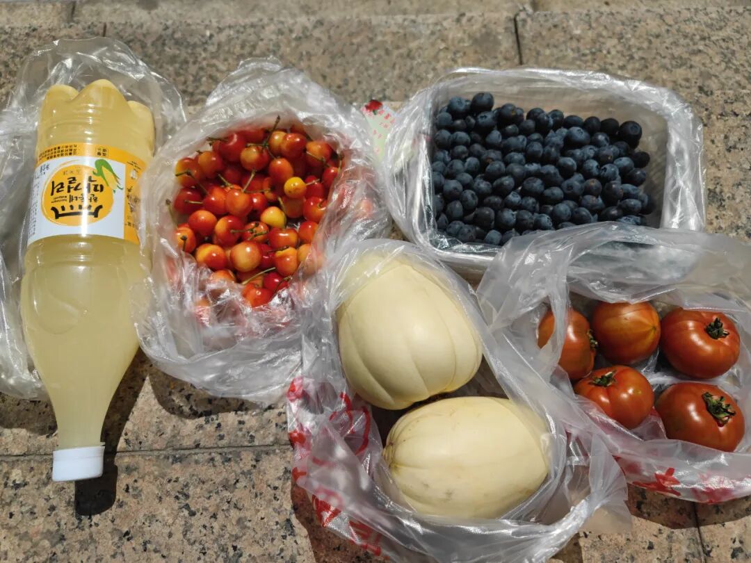 买了蓝莓、樱桃、水果西红柿、甜瓜和一瓶朝鲜玉米酒。