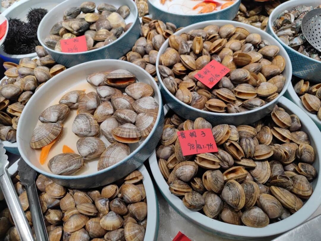 各种贝类,很大的一盘,价格都在保鲜膜上写着。