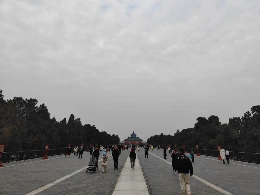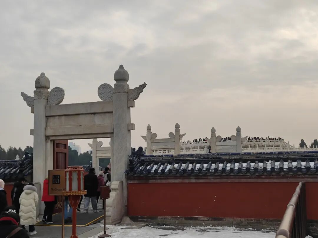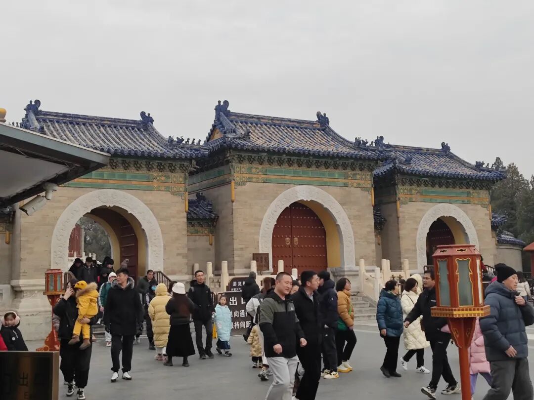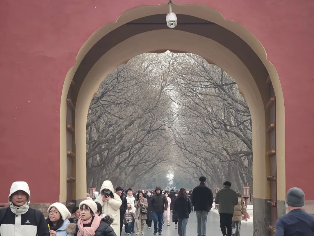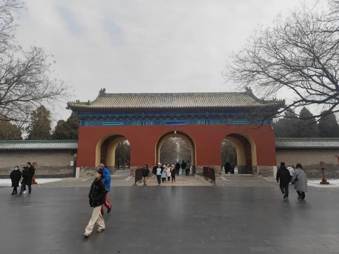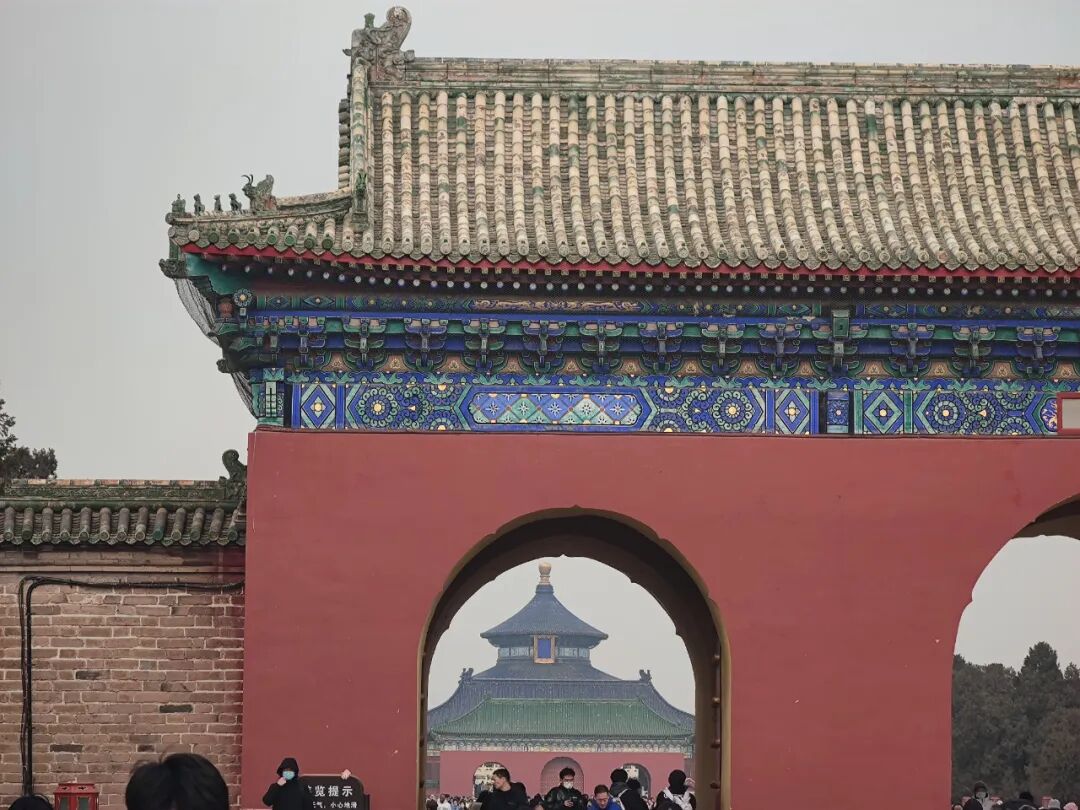走到南北线上,透过成贞门的门洞可以看到北面远处的祈年殿。