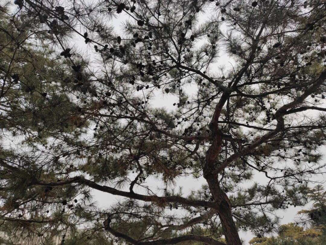 抬头的松树上全是松塔。我一直很疑惑,在北京看到的松塔为什么都是空的,没有松子?