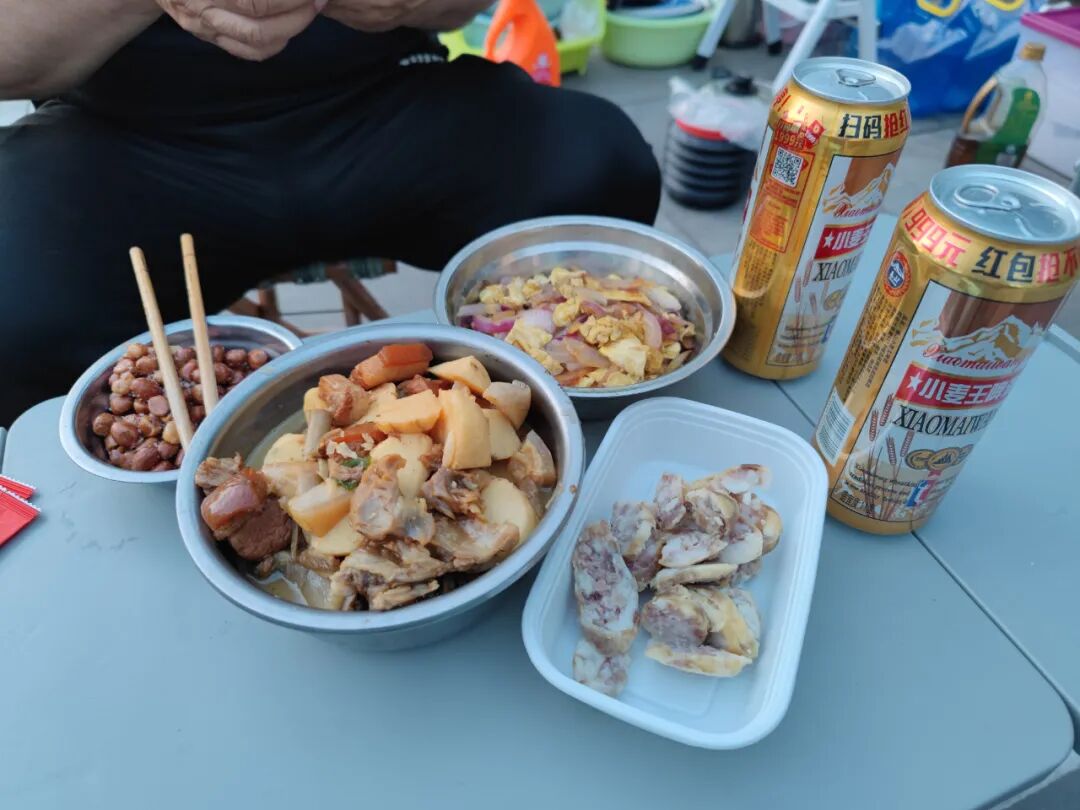洋葱炒鸡蛋,热了大哥从家里带的大嫂炖的慈姑五花肉,剩下的花生米和香肠都是现成的,大哥还问我喝不喝白酒,我说真喝不了,大哥就从冰箱里拿了两听冰镇啤酒。