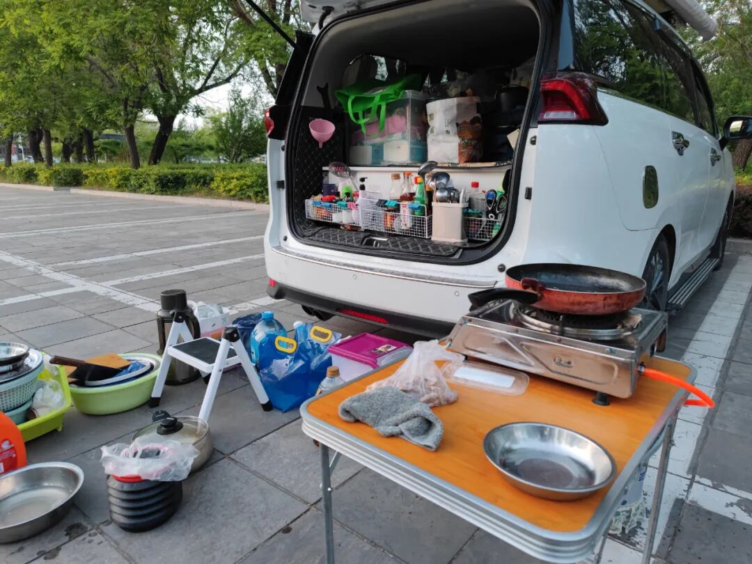 大哥的装备太全了,我就说主要的:电池有三块,冰箱,煤气罐和家用灶台,各种调料和厨具……我内心暗暗佩服。