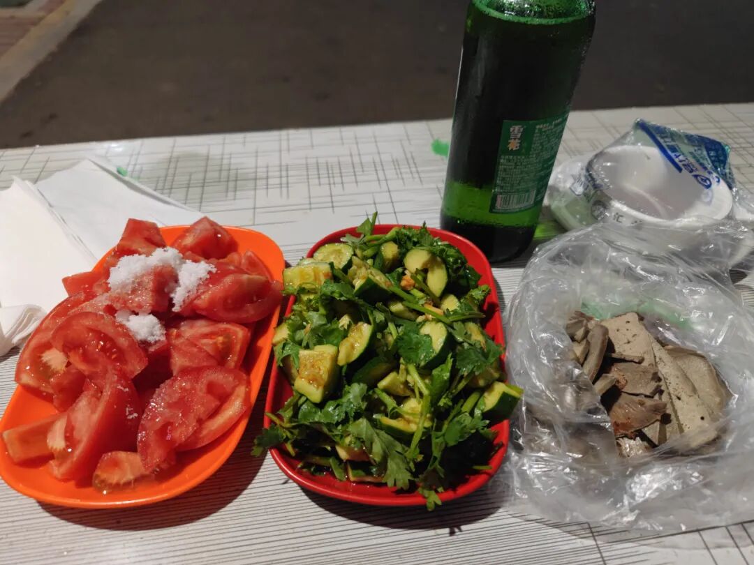我旁边挨得很近有桌人在喝酒,本地的小伙子们,光着膀子,看啤酒瓶子没少喝。我从他们桌上借了个瓶起子开啤酒。
