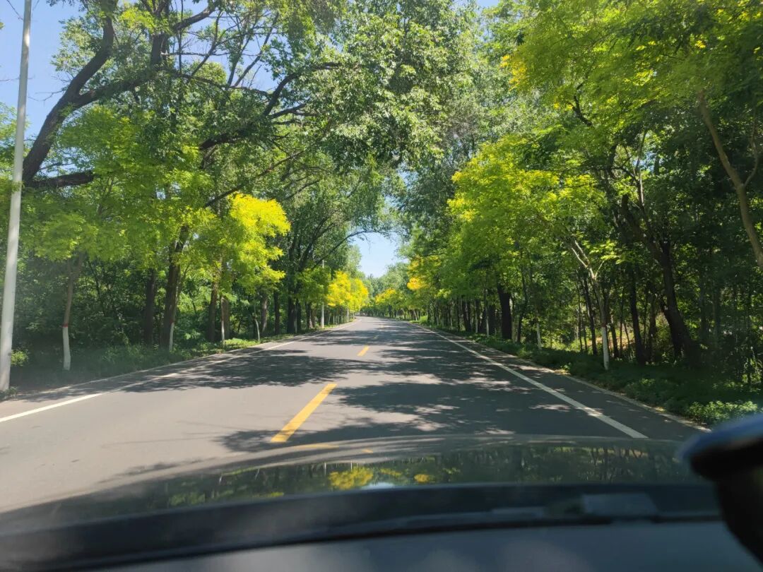 经过一条两边都是树的道路,很美。这种黄色树叶的树不知道是啥,这条路挺长,开着车很惬意。