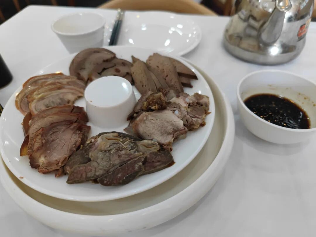 点不了太多,一份小拼盘,从左下向上依次是带皮驴肉、板肠、驴心、驴肝、口条、驴肺,蘸着小料吃,香极了。