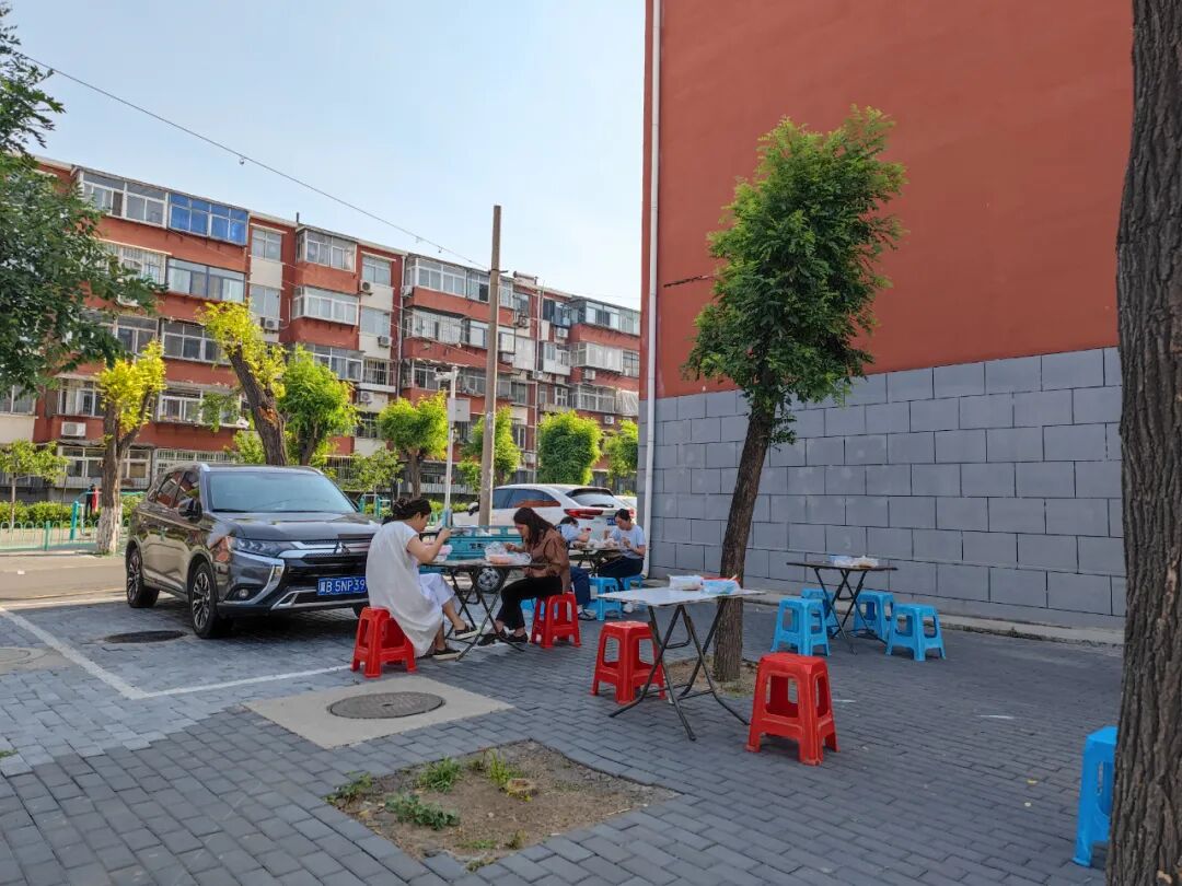 小区里摆着好多桌椅,反倒是早餐店里没人坐。