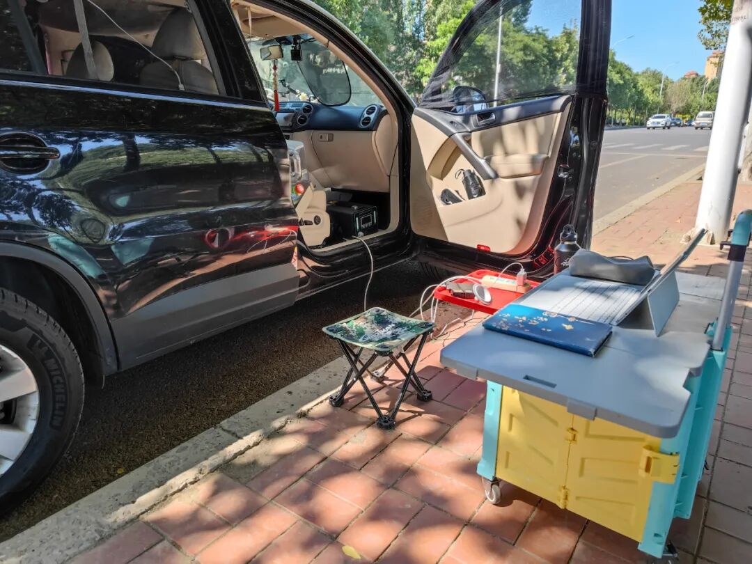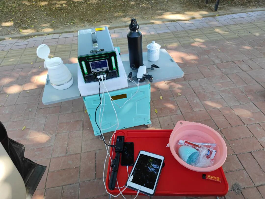 给各种工具充电,手机平板相机电脑无人机。蓄电池用了2天多,连烧水带充电,还剩40%的电。