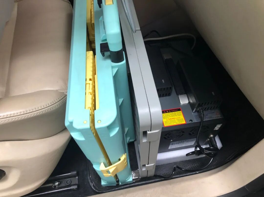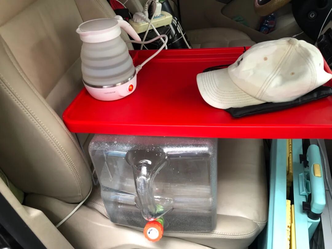 副驾驶车座上的水桶、小桌和水壶,水桶后来我用安全带绑住了。