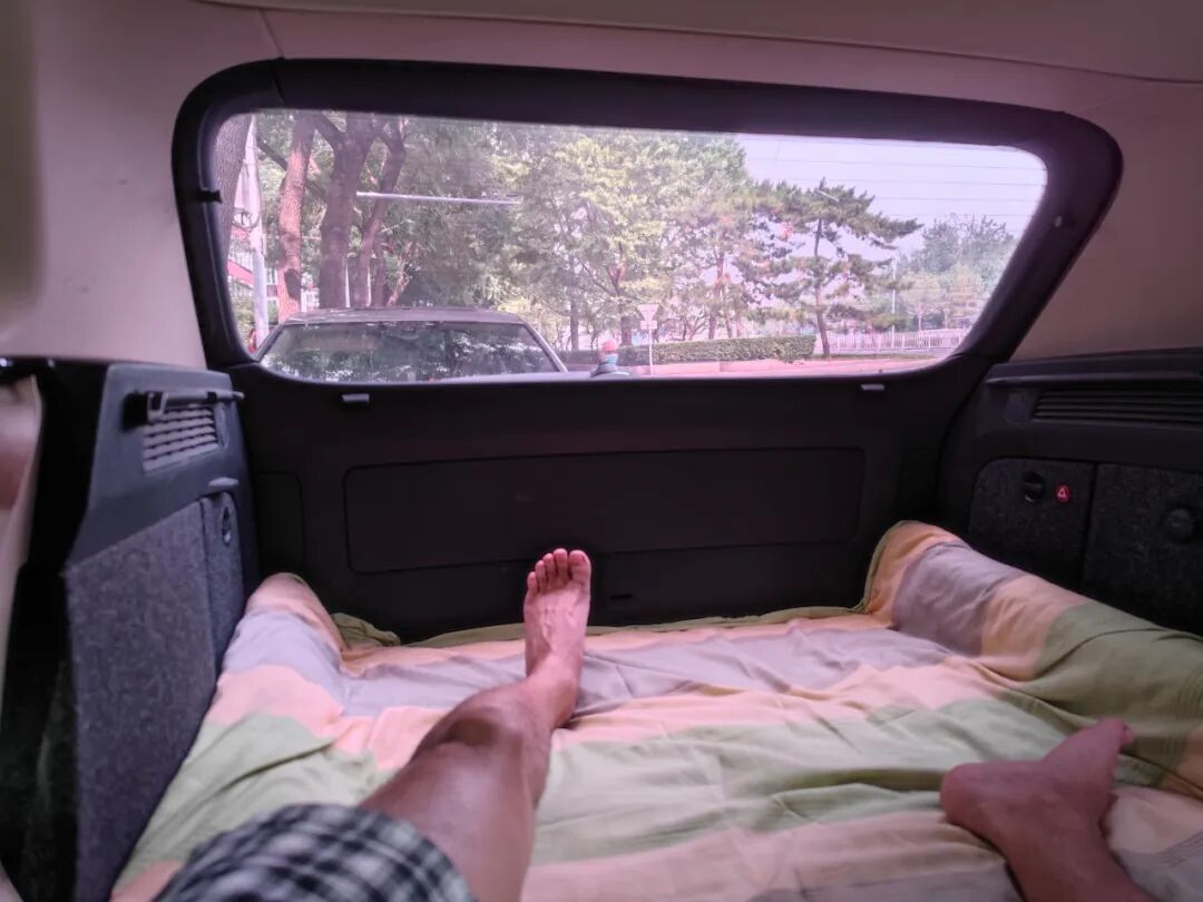 已经在车里睡了两天,放倒座位的地方有点高,因为后排座椅放平后会比后备箱高一块,头朝前和朝后各睡了一宿,头朝后睡得更舒服。