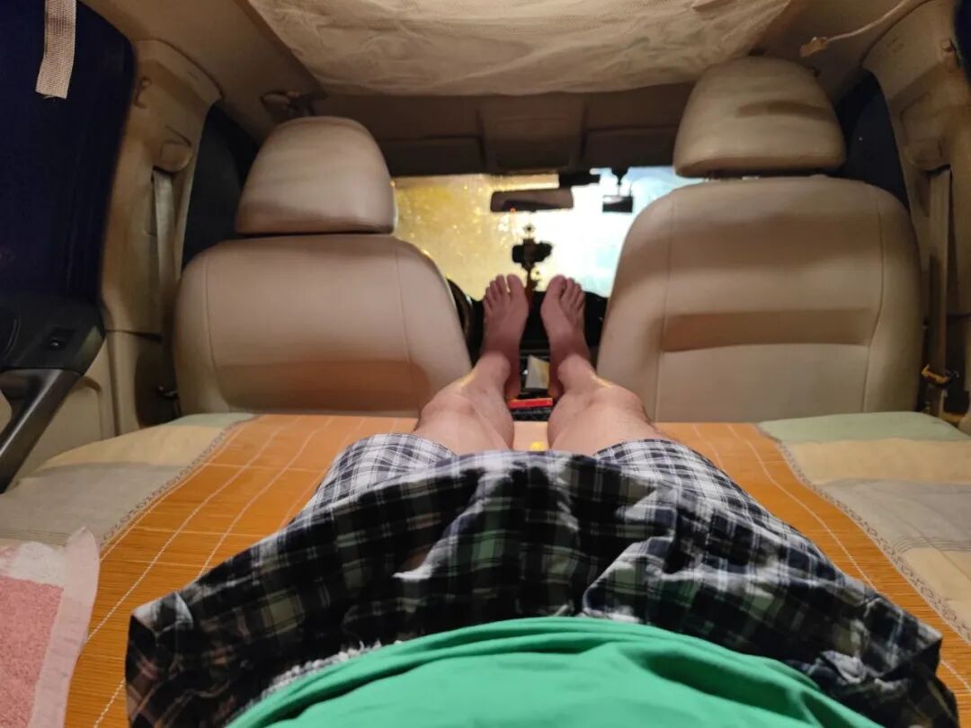上车的时候,我从驾驶室进来,把鞋脱掉把脚擦干,再从前座跨到后面的床上躺下。