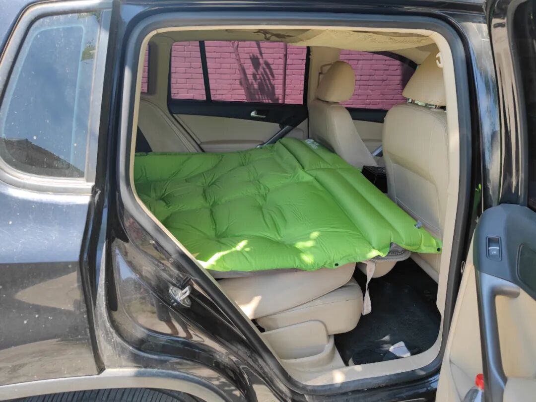后座放倒,铺上了我以前露营的充气垫。