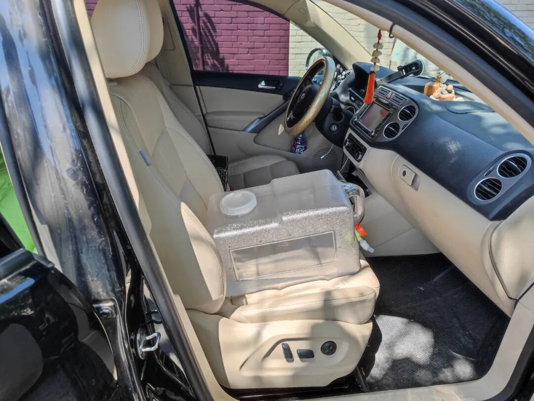 一个25L的水箱。本来想放在车顶行李箱里,但水管太短不行,又想放在后备箱处,觉得占地方,最后就先放在副驾上吧,用水时可以把后面垫高。