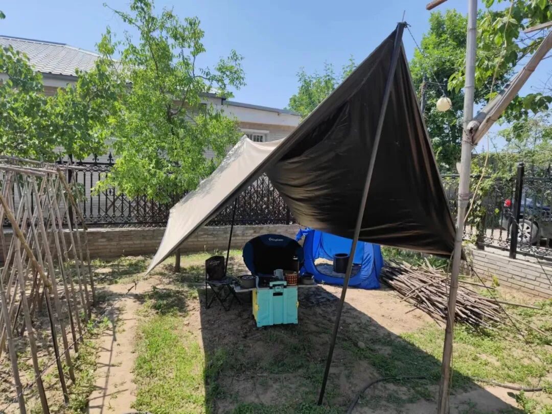 这个天幕,本来是想支在车门一侧的,但不太好弄,就先支在我家的院子里吧。