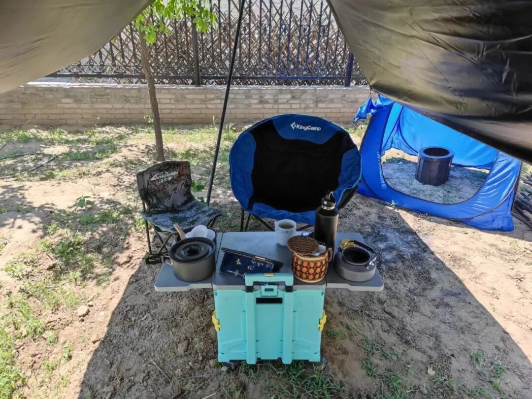 里面是跟了我多年的两张折叠椅,一大一小。前面这个“茶几”也是个很多年的运送行李的滑轮车,我常拉着它去超市买菜,它没有现在流行的那个长方形大容量的帆布露营推车好看和好用,但这些还可以用的我不会扔、也没必要再买新的,就凑合用了。