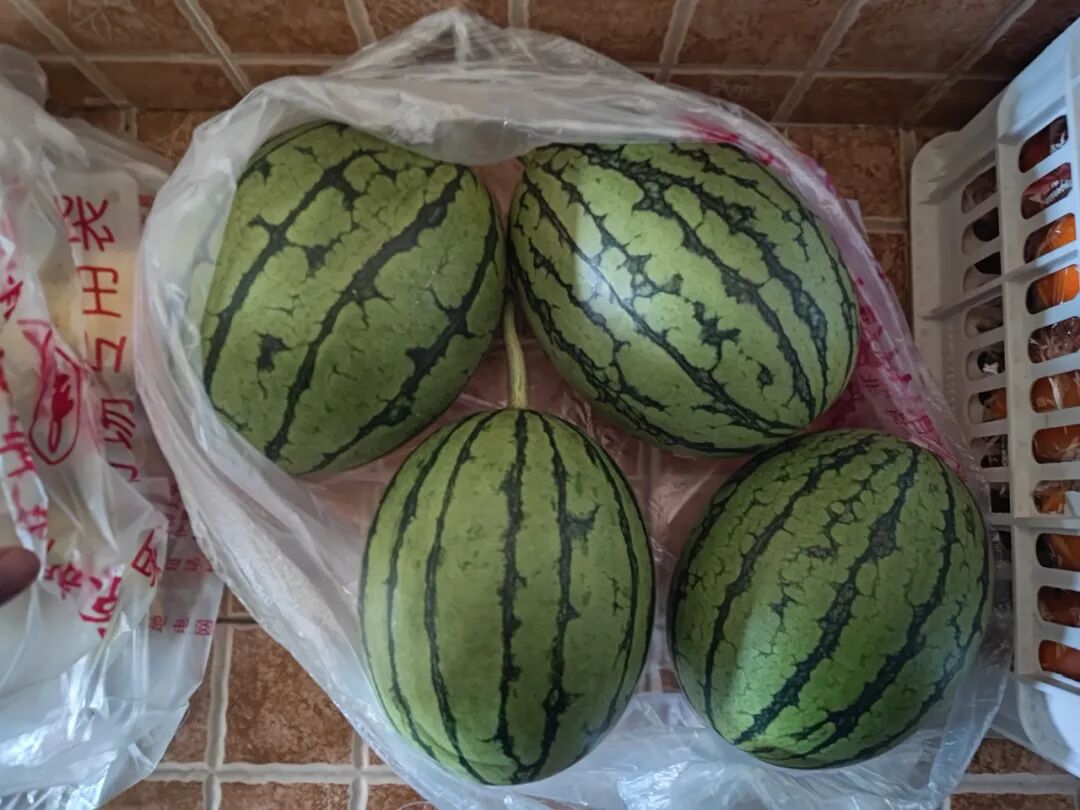 我开车转了一圈,停靠在一个小西瓜的摊位前,3元一斤,我买了4个。