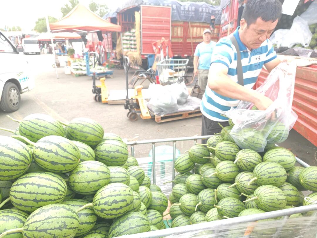 开车进来,根据季节不同,当季的水果会占据面积最大的地方,比如现在是西瓜的季节,这里停满了卖各种西瓜的大货车,都是一箱箱的。