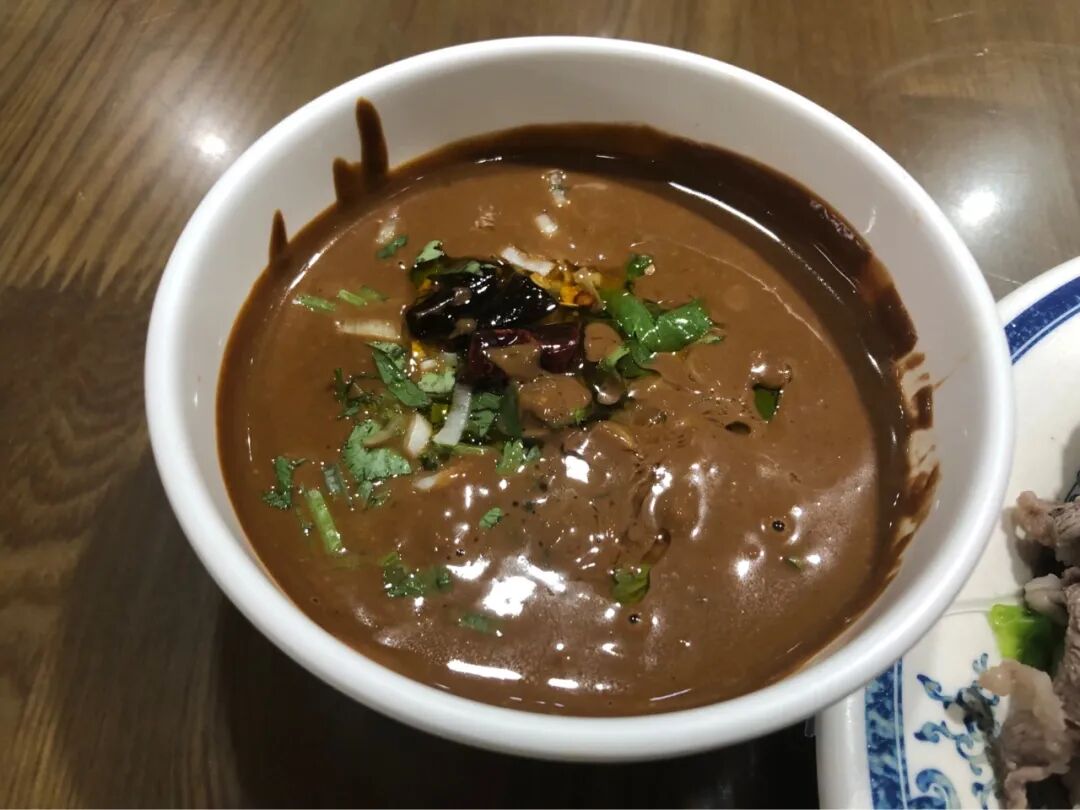 你不用说,服务员就会自动给你加一份麻酱小料,你再自己加点辣椒油,蘸着吃。