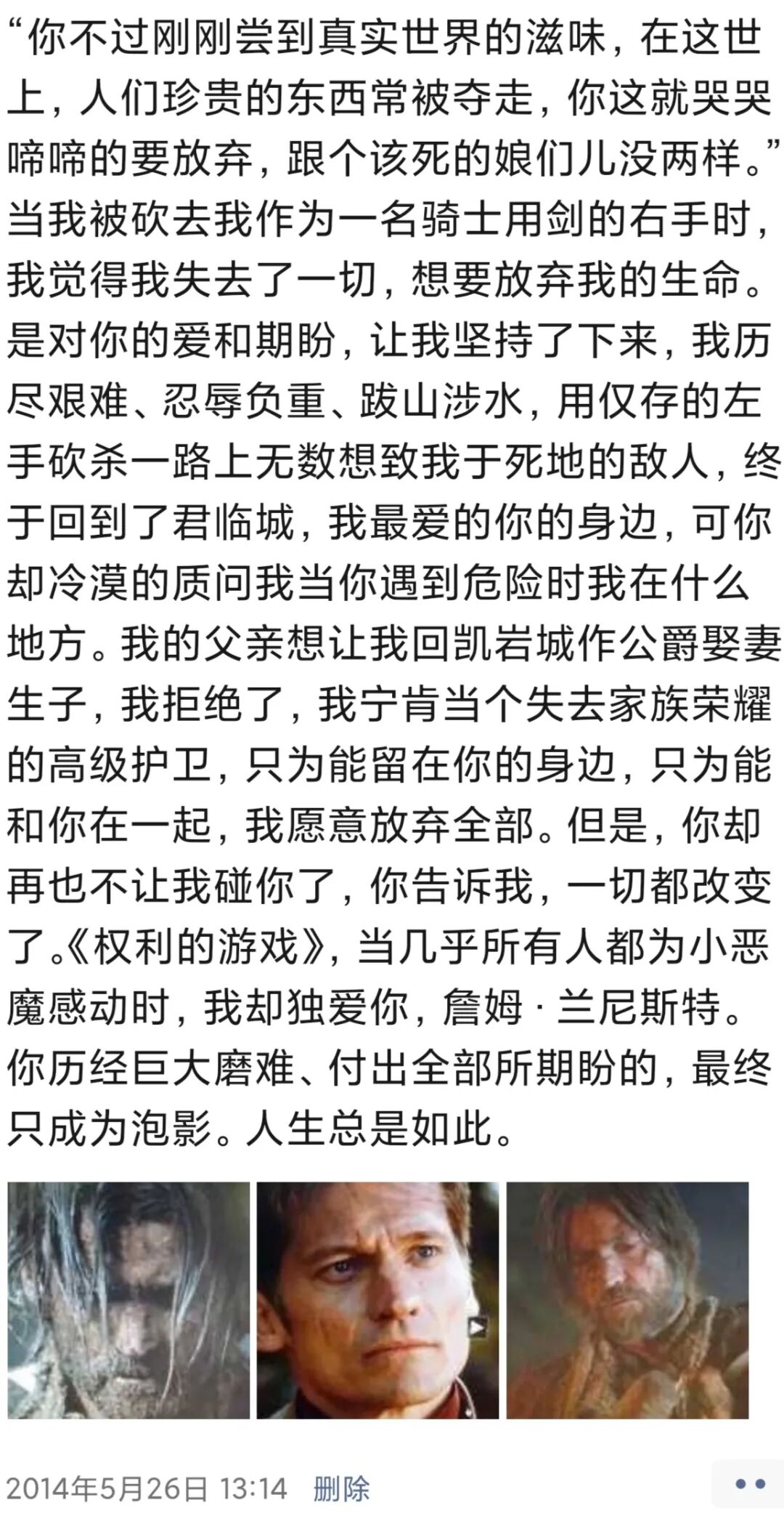 2019年《权力的游戏》最后一季,詹姆兰尼斯特重获骑士荣誉,活到大战结束的他最终却选择回到瑟曦身边,陪伴错爱一起被坍塌的城堡埋葬。