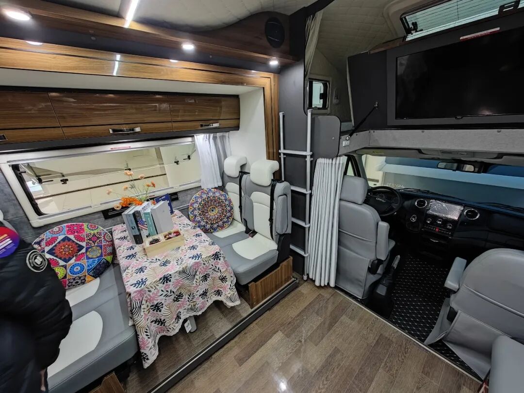 进去看看,这里是个客厅。一般车头驾驶室上面也是个床,支起来是电视,放下就是床。客厅茶几也都可以放下,变成另一张床。