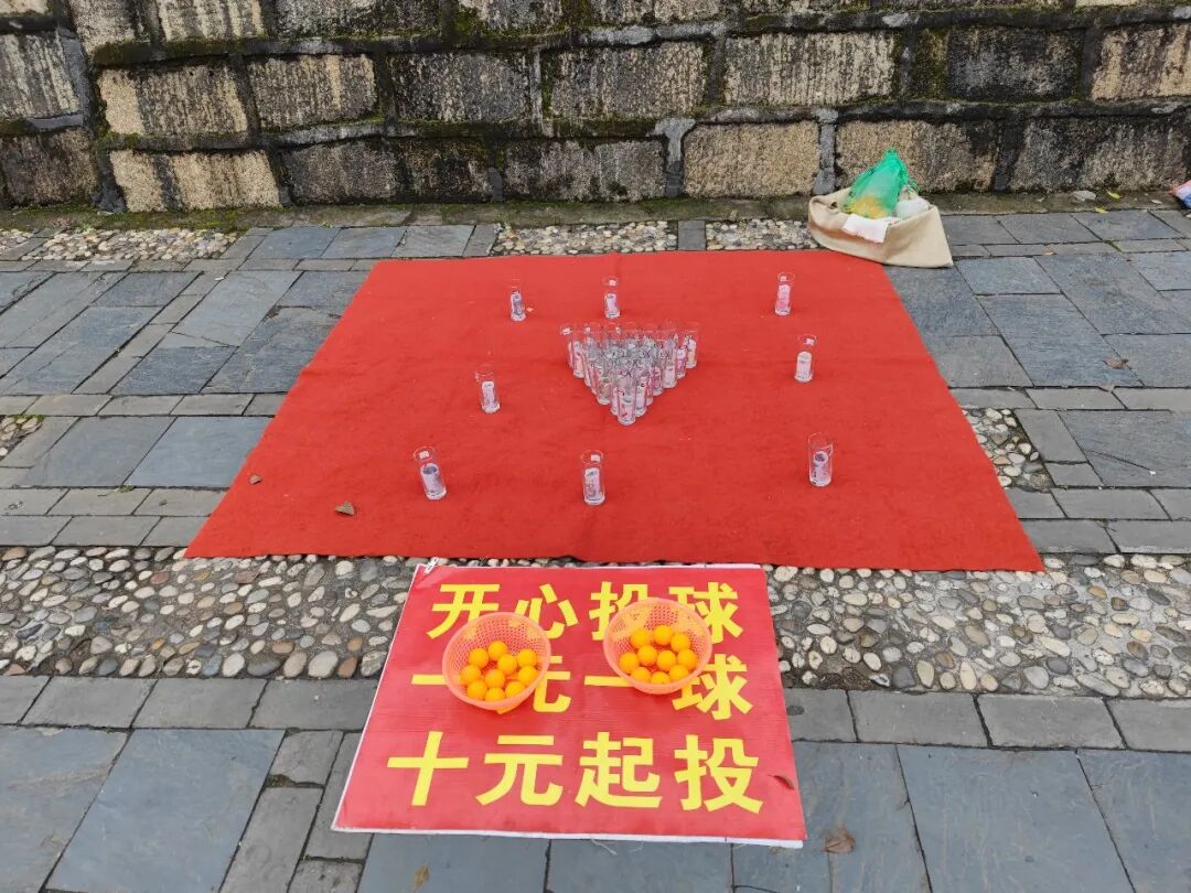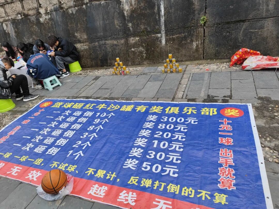 扔球砸红牛罐子。我看了半天,玩了3把,第一把砸倒6个,没有奖;第二把没砸到;第三把砸倒7个,还是没有奖……不玩了!