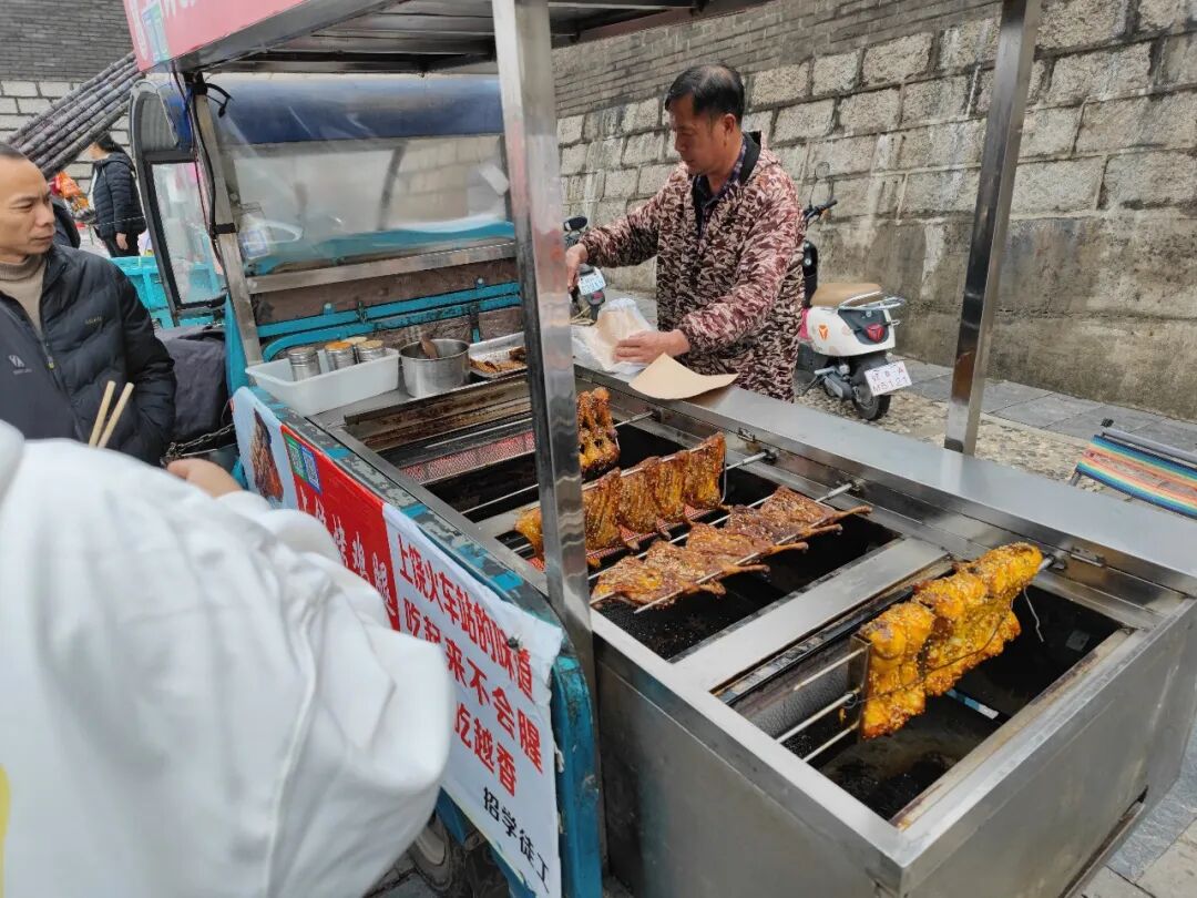 我在梅林古镇商业街也看到一个这样的车,劳动人民的智慧真不错,这种车载转动电烤鸡腿看着不赖。