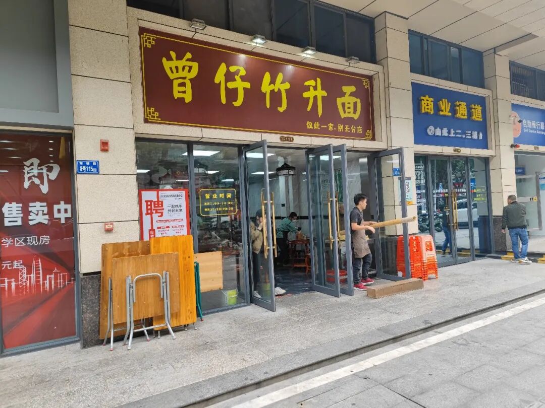 这是一家不多的还在用传统方法做面的店,门口的小伙子就在用大竹竿压面。