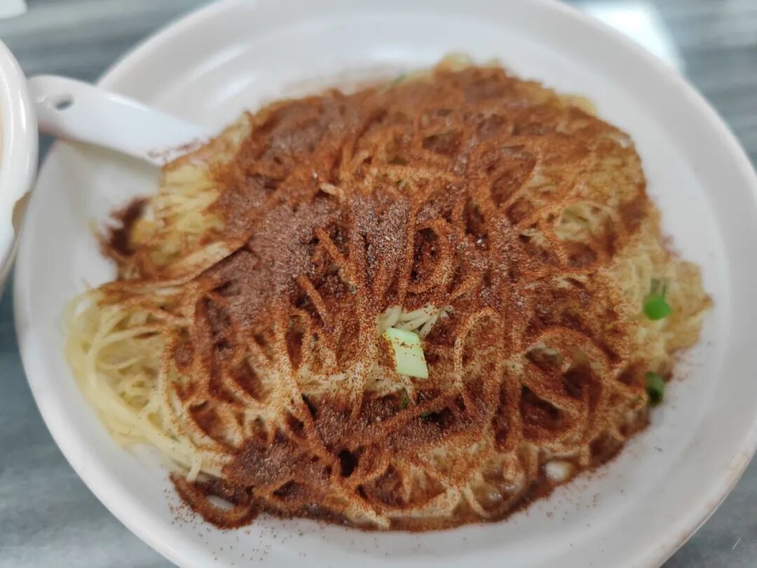 虾籽捞面。面上撒了一层厚厚的虾籽。我是第一次吃,面和配料都没尝过,第一口没觉得特别,但拌过之后,越吃越好吃,虾籽有一种特别的香味,面也异常劲道,一会儿就吃了个干干净净。