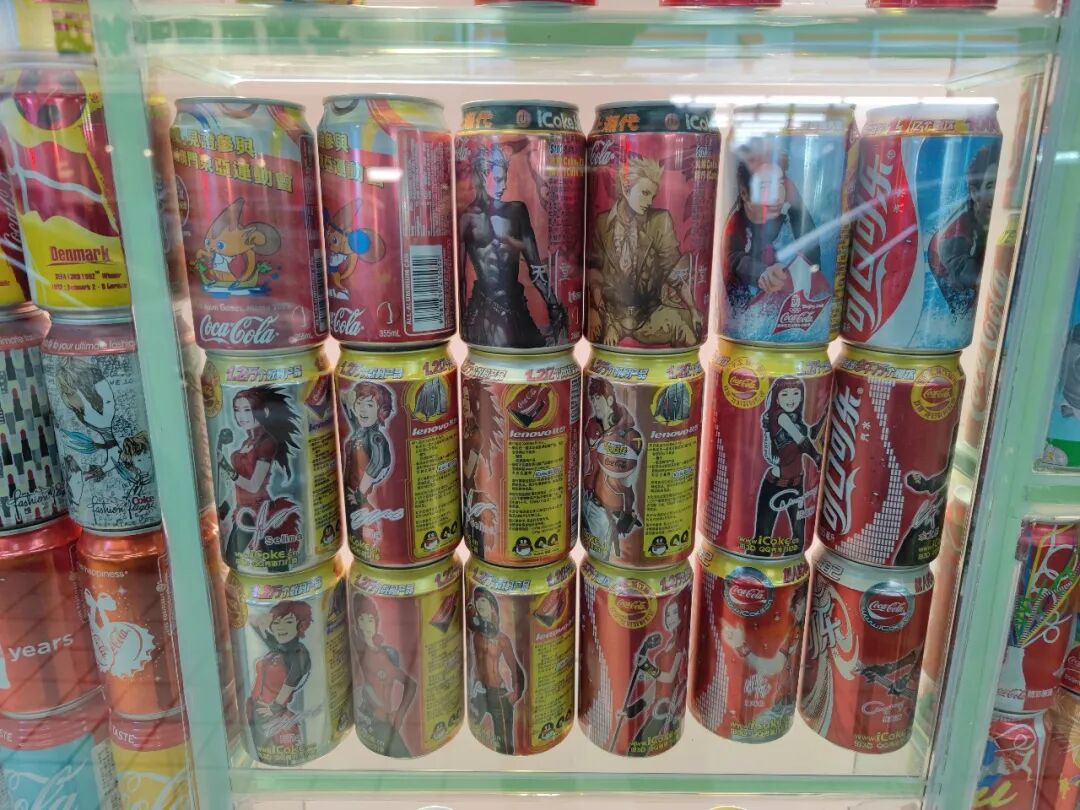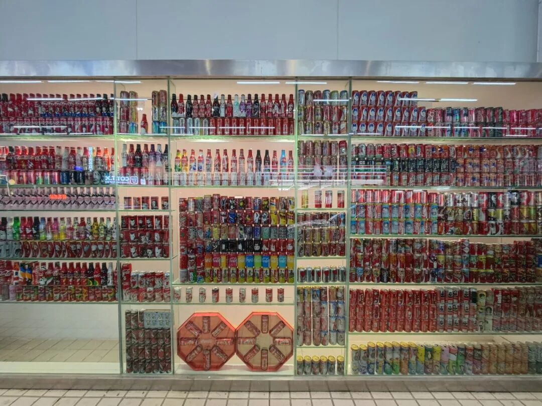 出门,一面全是特殊罐身可乐的玻璃墙。