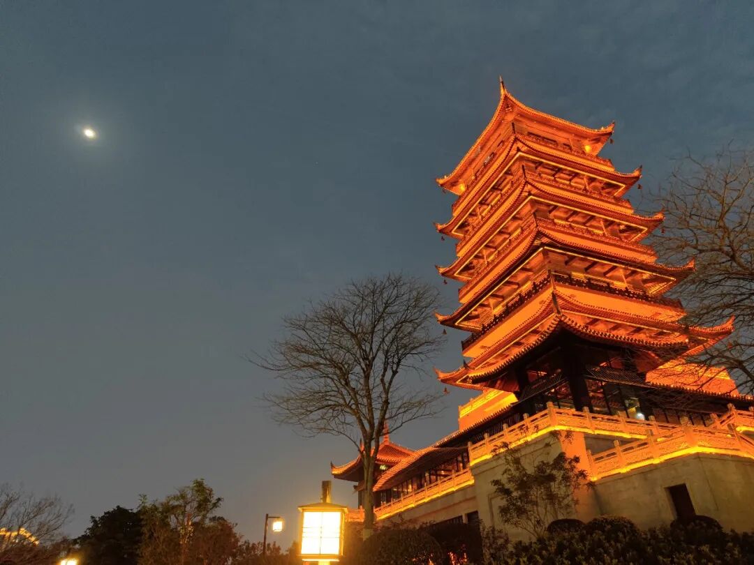 坡顶有座魁星阁,夜晚灯光映照很美。